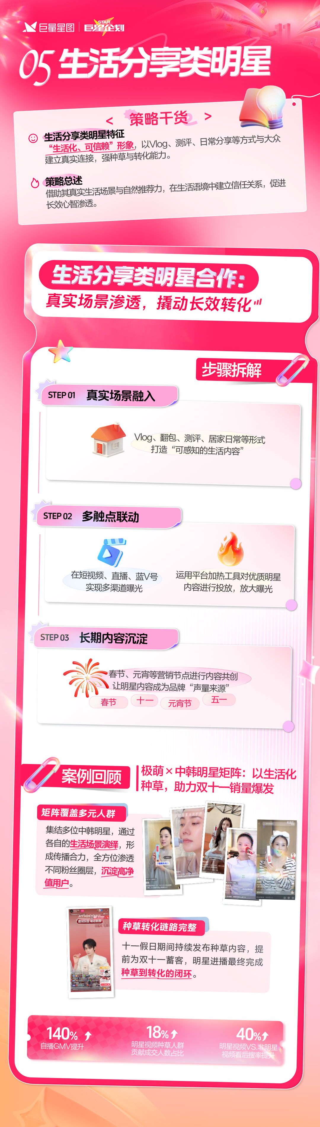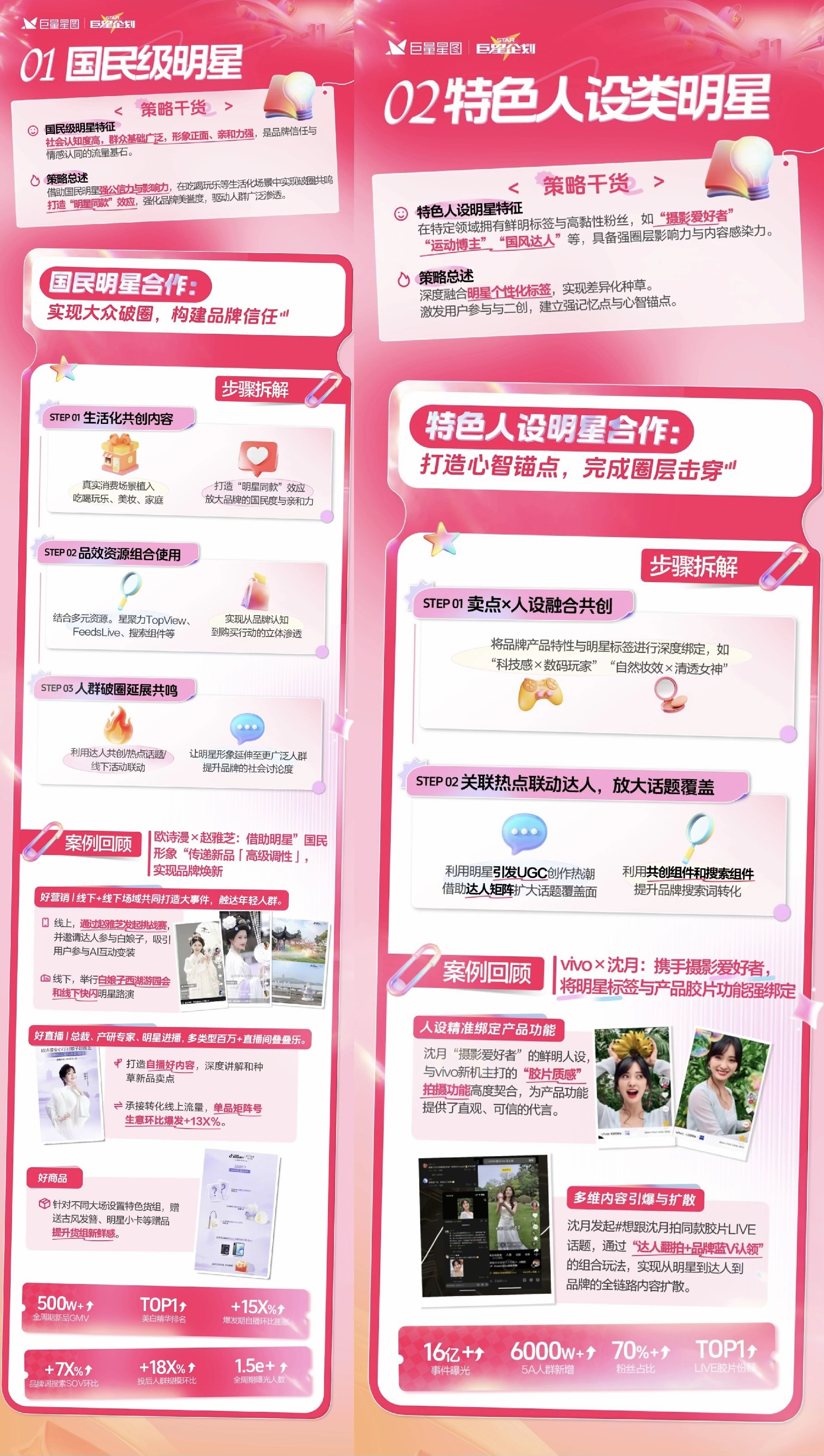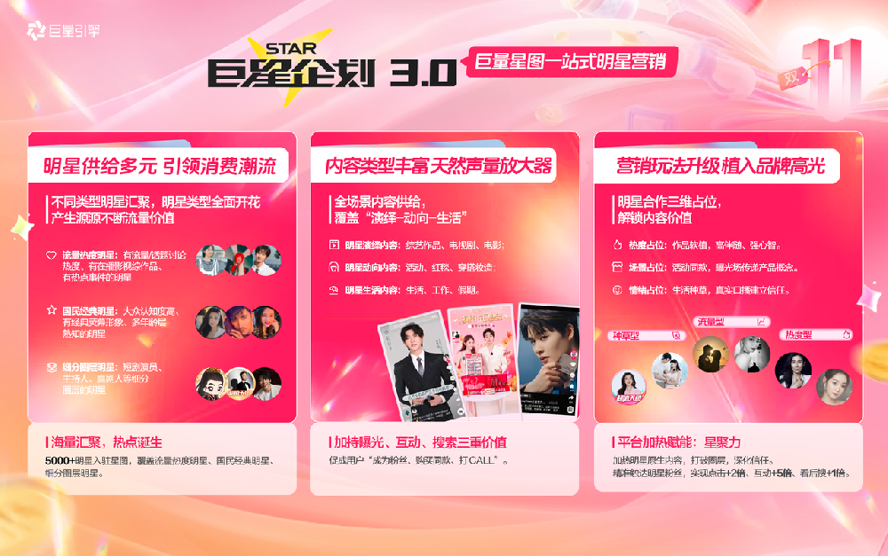 在此背景下,巨量星图聚焦明星营销场景,重磅升级「巨星企划3.0」,通过丰富的明星类型供给与多元玩法,将明星流量精准转化为品牌资产,为品牌提供覆盖声量曝光、人群渗透、生意增长的全链路营销解决方案。