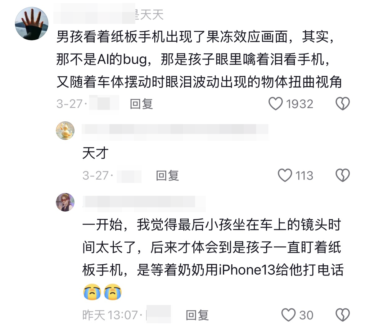 男孩跟着父母上车后,安静地坐在后排攥着手机等了很久很久,长达2分钟的镜头车窗外场景无限闪过,直到手机上掉下一滴眼泪,影片戛然而止... ... 评论区开始拉片式解读,也许是男孩懂了,再也联系不到,就叫去世。