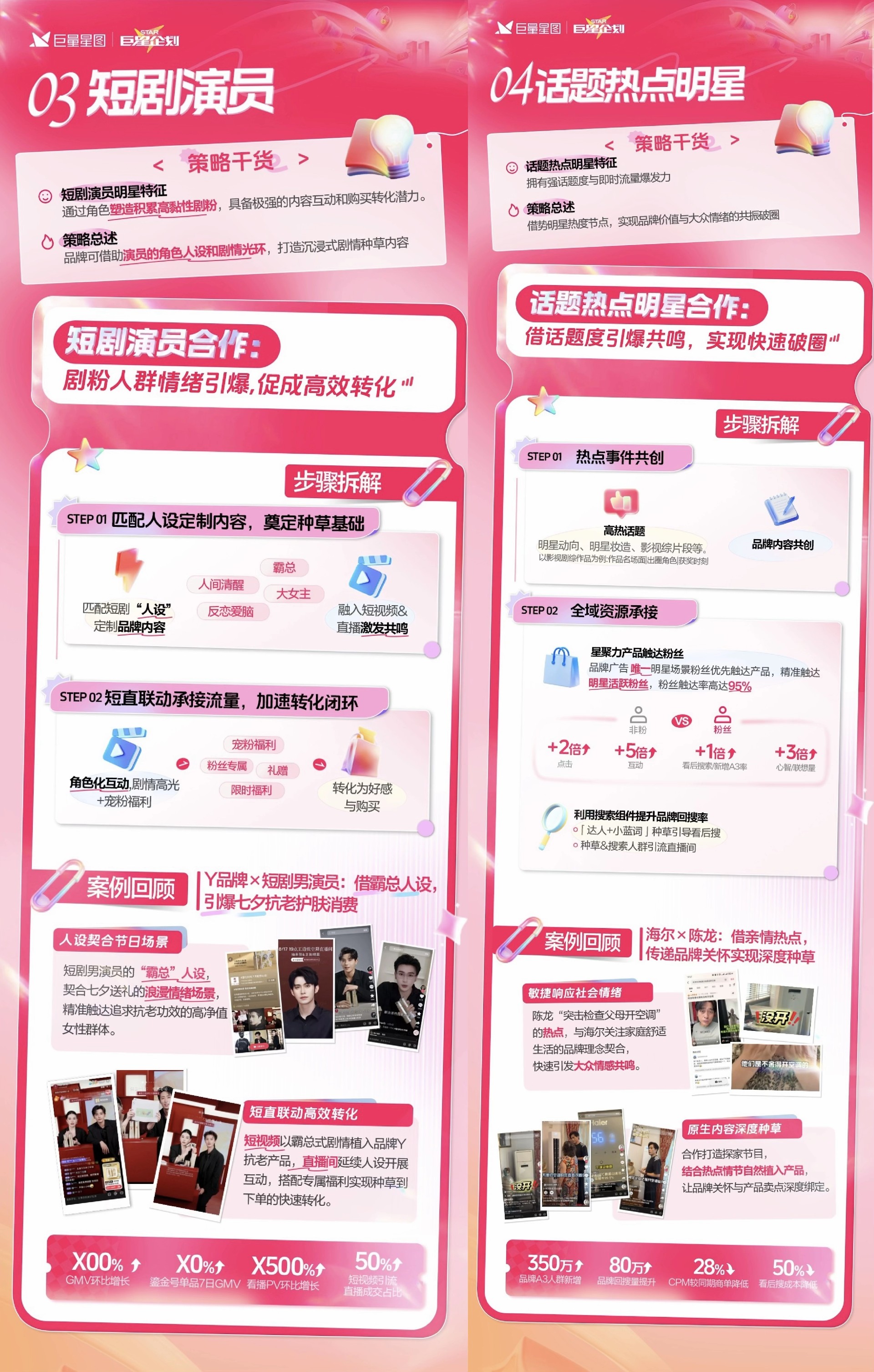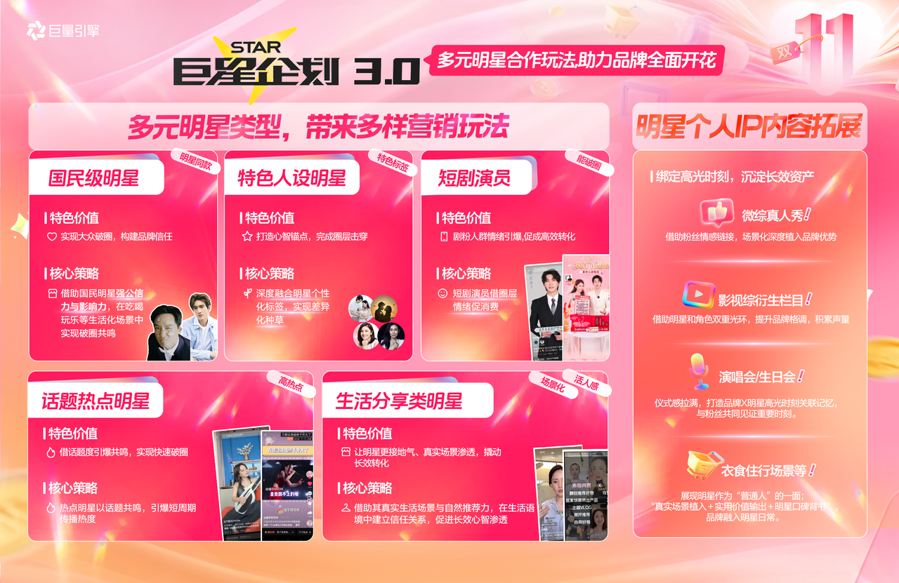 在此背景下,巨量星图聚焦明星营销场景,重磅升级「巨星企划3.0」,通过丰富的明星类型供给与多元玩法,将明星流量精准转化为品牌资产,为品牌提供覆盖声量曝光、人群渗透、生意增长的全链路营销解决方案。