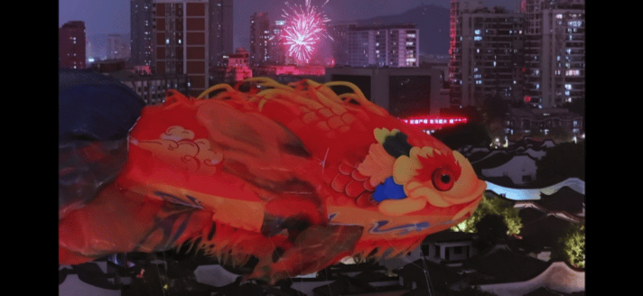 @南翔 花了近100万,在福州上空画了一条会飞的锦鲤。他复刻亚运会“福鱼空飘”技术,将《山海经》中的文鳐鱼做成了20米长的巨型空飘。元宵夜,福鱼升空,游于三坊七巷的青瓦古巷之上。