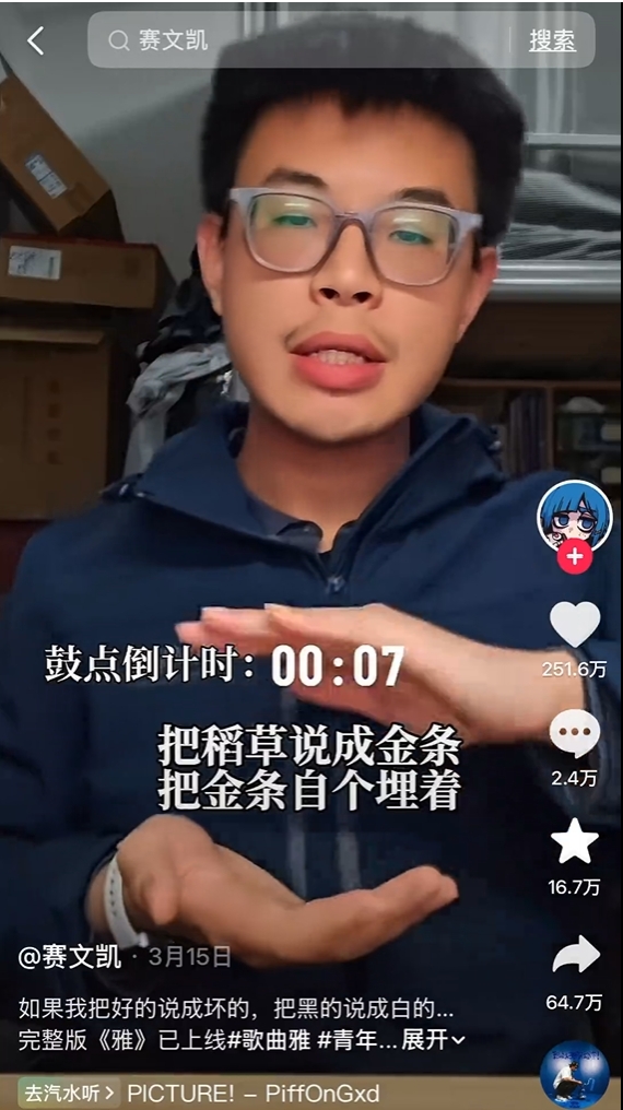 @赛文凯 一周之内,用两首原创,获得了破亿人次的观看,作品点赞近400万。他写的是成年人最怕被戳破的那些东西:“把推诿说成合作,把内卷说成竞争,表面风平浪静,背地里较劲硬撑……”
